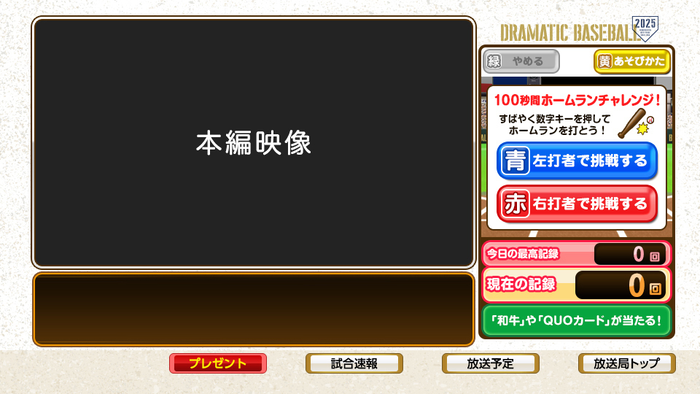 - ホームランの直後にテレビの電源をオフにしたり他のチャンネルを選局した場合、プレゼントキーワードが表示されない場合があります。