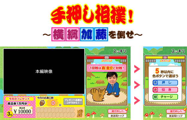 - お持ちの地上デジタル対応テレビで、視聴者参加企画中にTVリモコンの4色ボタンを押して投票にご参加ください。