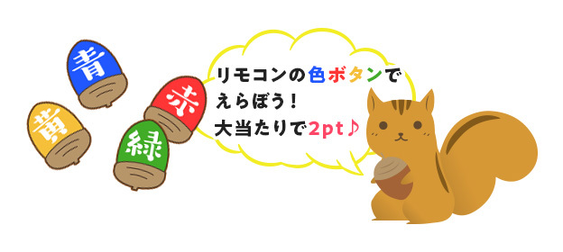※リモコンの色ボタンで選択後にテレビの電源OFFや、チャンネル選局などで、結果を確認していない場合はどんぐりが加算されません。ご注意ください。 - 1か月の期間中にどんぐりを【20PT】ためるとプレゼントに応募できます。